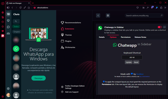 Chatwapp in Sidebar es una extensión para Firefox que permite abrir la plataforma de chat Chatwapp directamente desde la barra lateral del navegador. Esta herramienta facilita el acceso a las conversaciones sin tener que cambiar de pestaña, optimizando la experiencia de usuario. La extensión añade una nueva sección en la barra lateral donde se puede gestionar el chat, y ofrece la opción de alternar su visibilidad mediante un botón dedicado o un atajo de teclado, que por defecto es Alt+W.